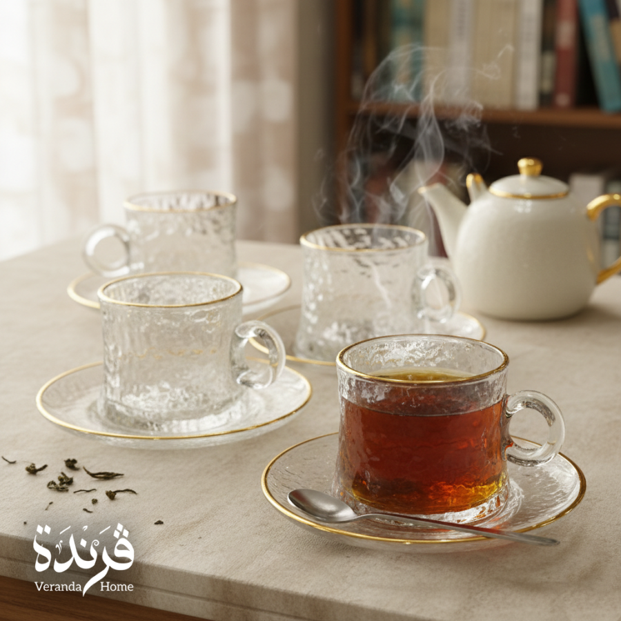 طقم 6 كاسات شاي مع 6 صحون بتصميم انيق مذهب