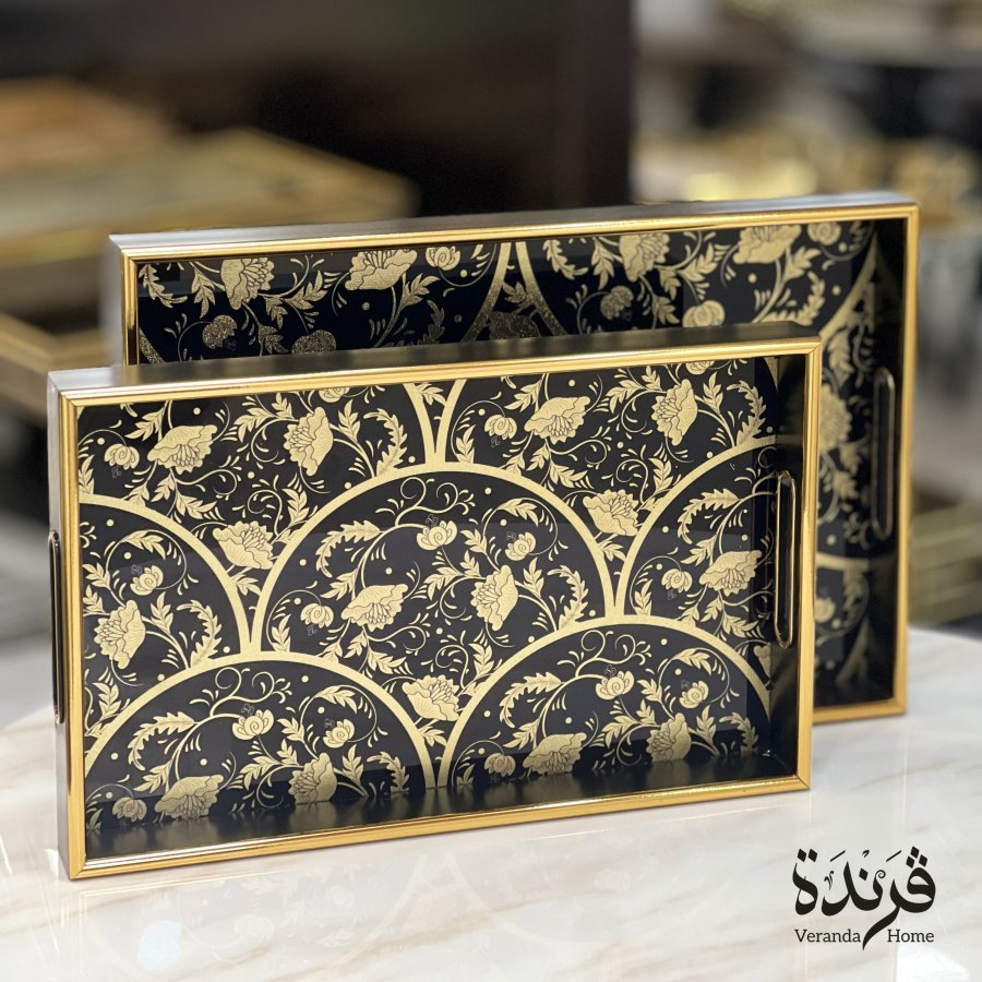 طقم 2 صواني اسود وذهبي زخرفة الأقواس الذهبية