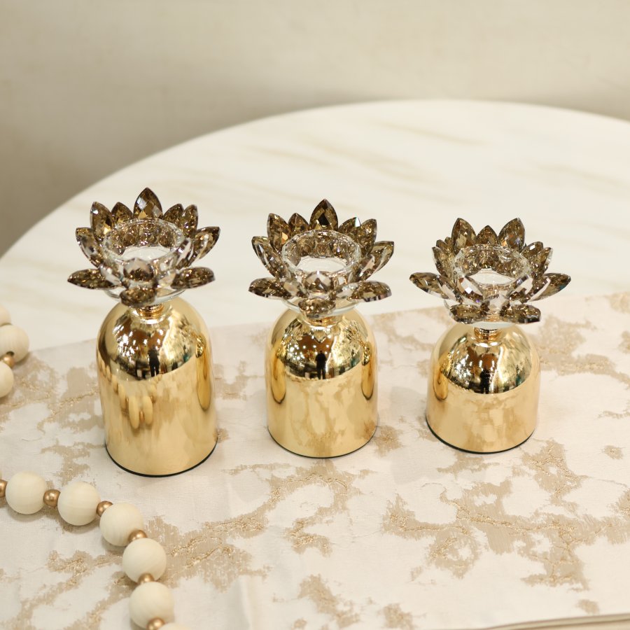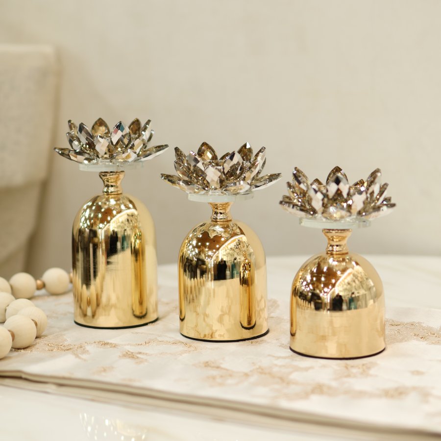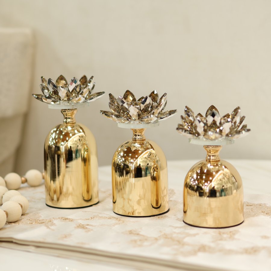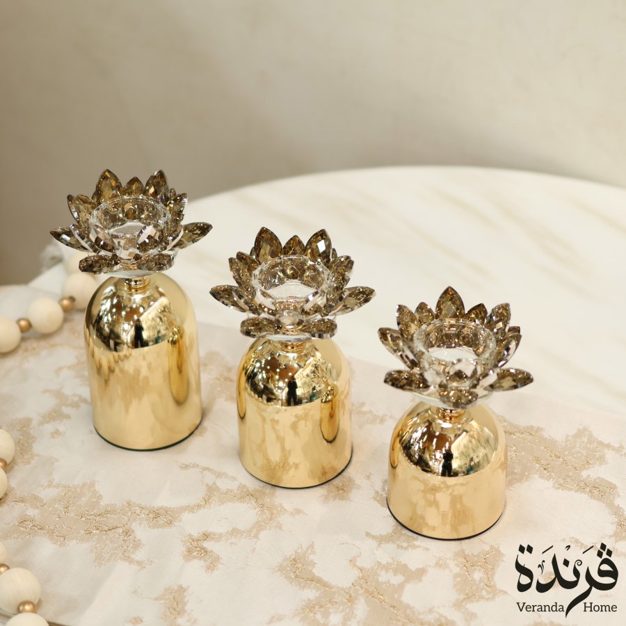 طقم شمعدانات معدن ذهبي مكون من 3 قطع بعدة احجام بتصميم زهرة اللوتس كريستال